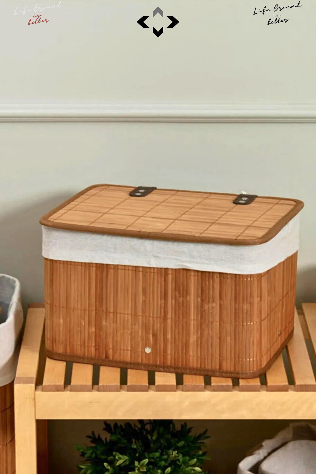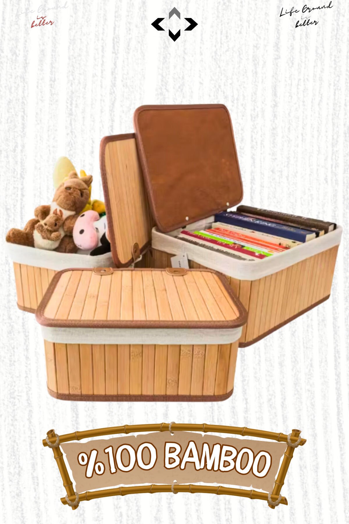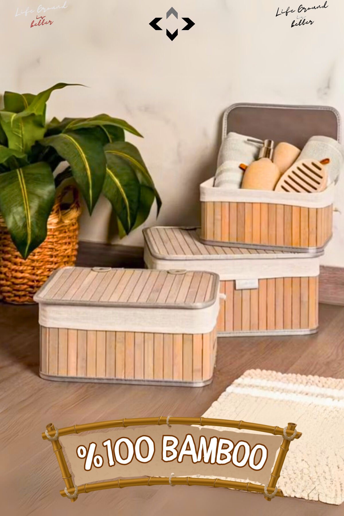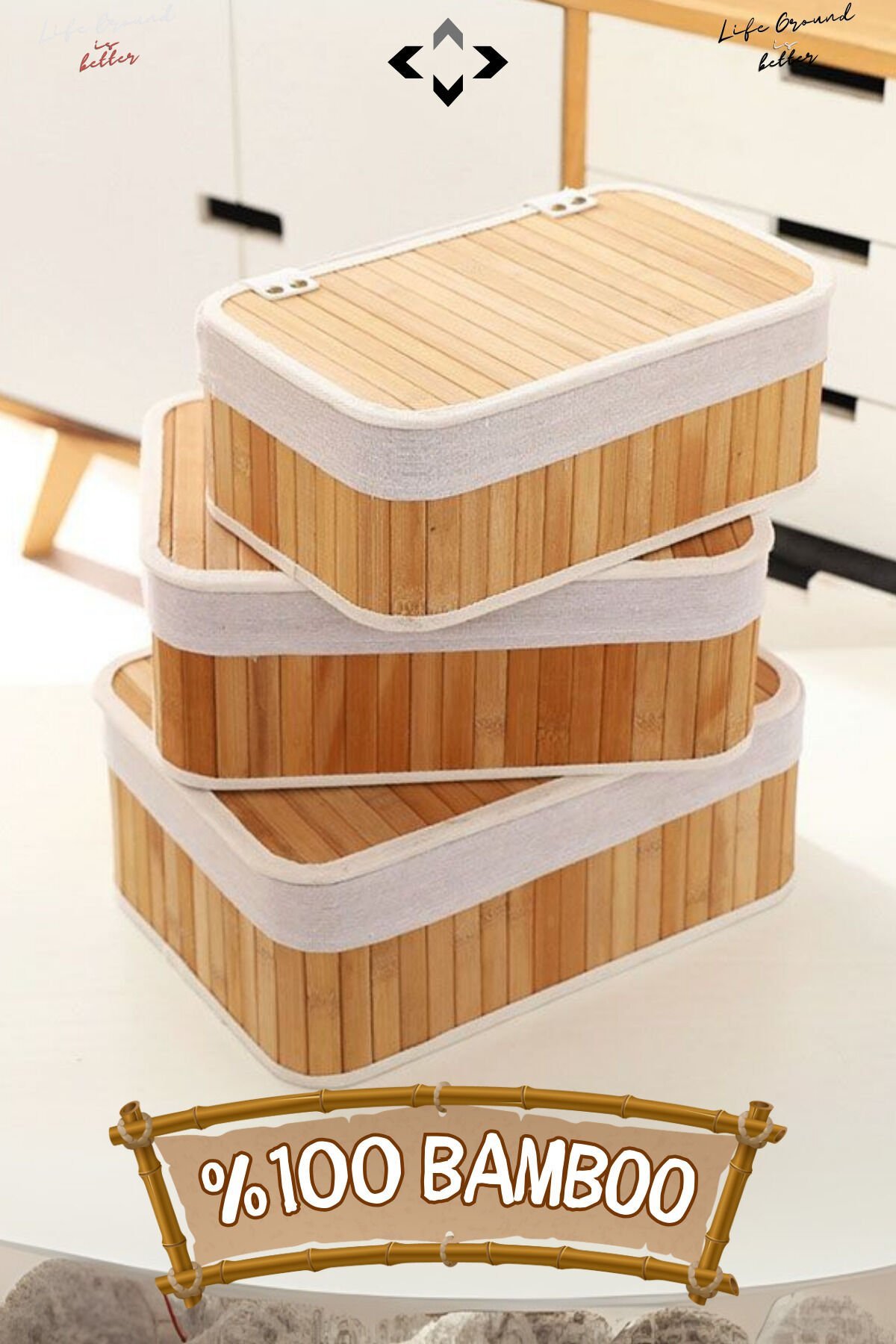 3'lü Bambu Sepet Kapaklı Hasır Bambu Ahşap Sepet Bambu Organizer Ev Düzenleyici Toplama