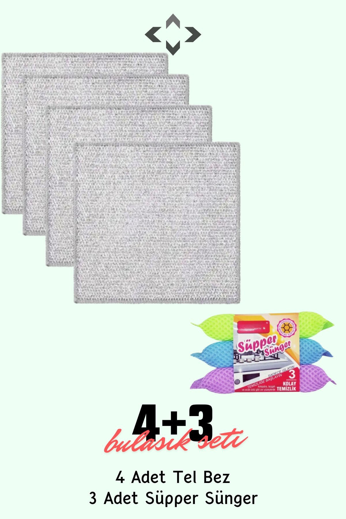 4 In 3 Bulaşık Seti 4 Adet Tel Bulaşık Bezi 3 Adet Süpper Sünger Çizmez Bulaşık Teli Çelik Çift Kat