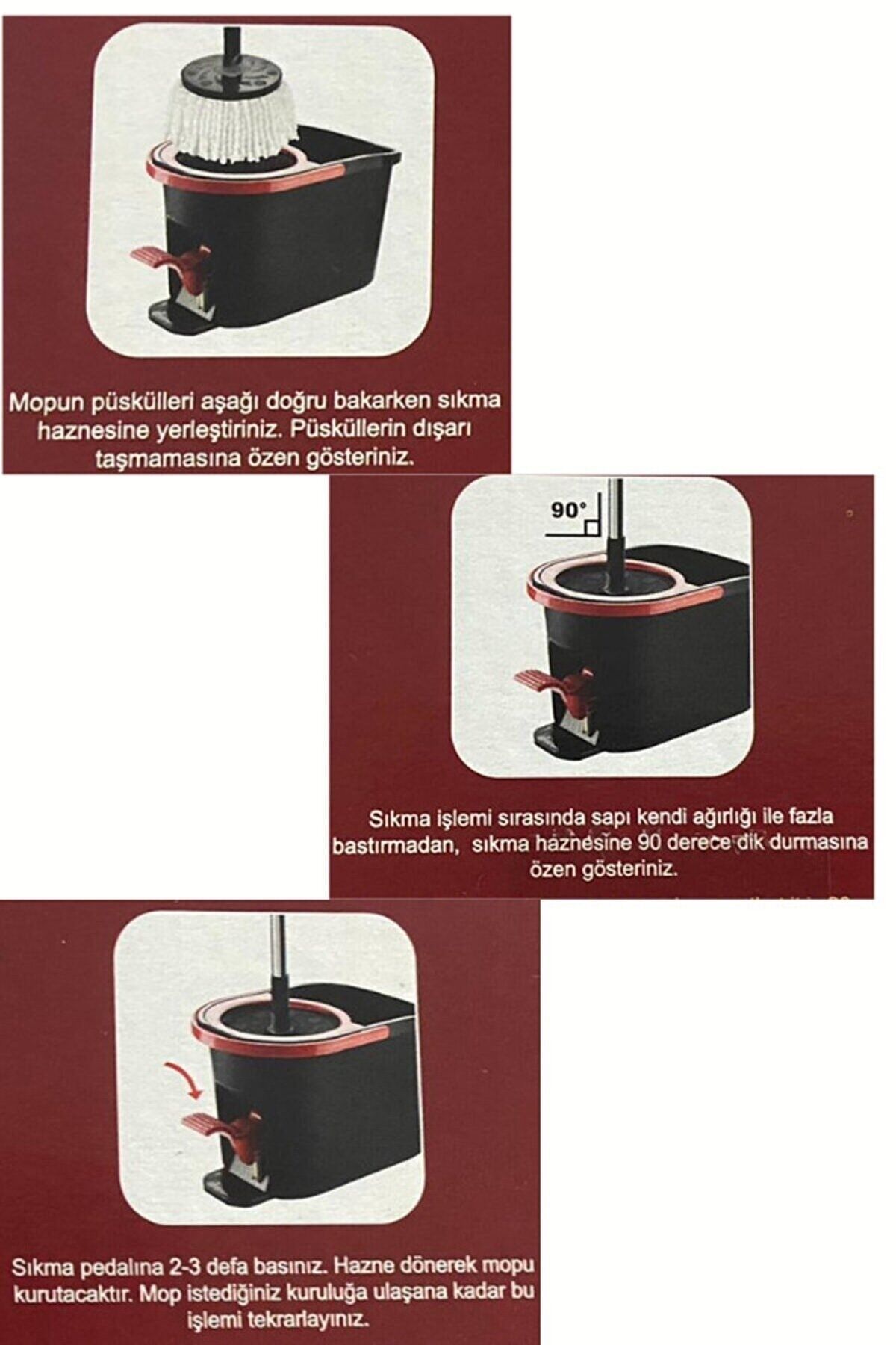 CLEANPED Pedallı Temizlik Seti 3 Adet Yedek Mop HEDİYE! Pedallı Kolay Temizlik Kol gücü gerektirmediği için daha az yorucudur. ; Pedal tahrikli santrifüj ,mopun çok daha hızlı ve verimli kurumasını sağlar. ; iSTEDİĞİNİZ KURULUK SEVİYESİNE ULAŞANA KADAR PEDALA BASMANIZ YETERLİDİR. ; %100 mikrofiber temizlik ile temizlik çok daha kolaydır. ; Zorlu kirleri kolayca çıkarır ve saç,tüy gibi döküntüleri kolaylıkla toplar ve içine hapseder. ; Oynar mafsalı sayesinde koltuk kanepe gibi eşyaları yerinden hareket ettirmenize gerek kalmadan altlarını zahmetsizce temizleme imkanı sağlar. ; Teleskobik borusu ile boyunuza göre ayarlayın, bel ağrısı çekmeyin. ; TAK-ÇIKAR MOP ESKİDİĞİNDE YEDEK MOP İLE DEĞİŞTİRMESİ OLDUKÇA KOLAYDIR. ; HER TÜRLÜ ZEMİNDE KULLANIMA UYGUNDUR. ; Kutu içeriği: ; 1adet pedallı temizlik kovası ; 1 adet 2 parçadan oluşan sap ; 1 adet 170 derece dönen mafsallı kapak ; Toplamda 3 adet %100 mikrofiber mop ; KULLANIM TALİMATI: ; Mopun püskülleri aşağı doğru bakarken sıkma haznesine yerleştiriniz. Püsküllerin dışarı taşmamasına özen gösteriniz. ; Sıkma işlemi sırasında sapı kendi ağırlığı ile bastırmadan, sıkma haznesine 90 derece dik durmasına özen gösteriniz. ; Sıkma pedalına 2 - 3 defa basınız. Hazne dönerek mopu kurutacaktır. Mop istediğiniz kuruluğa ulaşana kadar bu işlemi tekrarlayınız ;