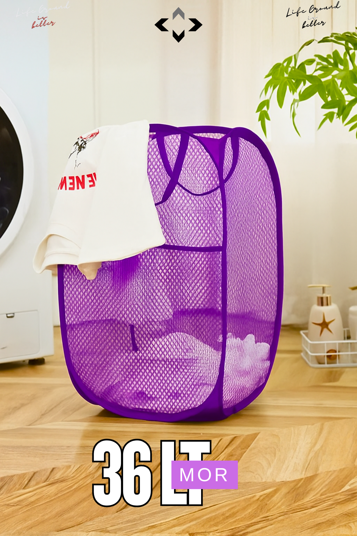 Mor 36 LT Katlanabilir Çamaşır Sepeti Hurç Oyuncak Kutusu Çok Amaçlı Katlanır File Çamaşırlık