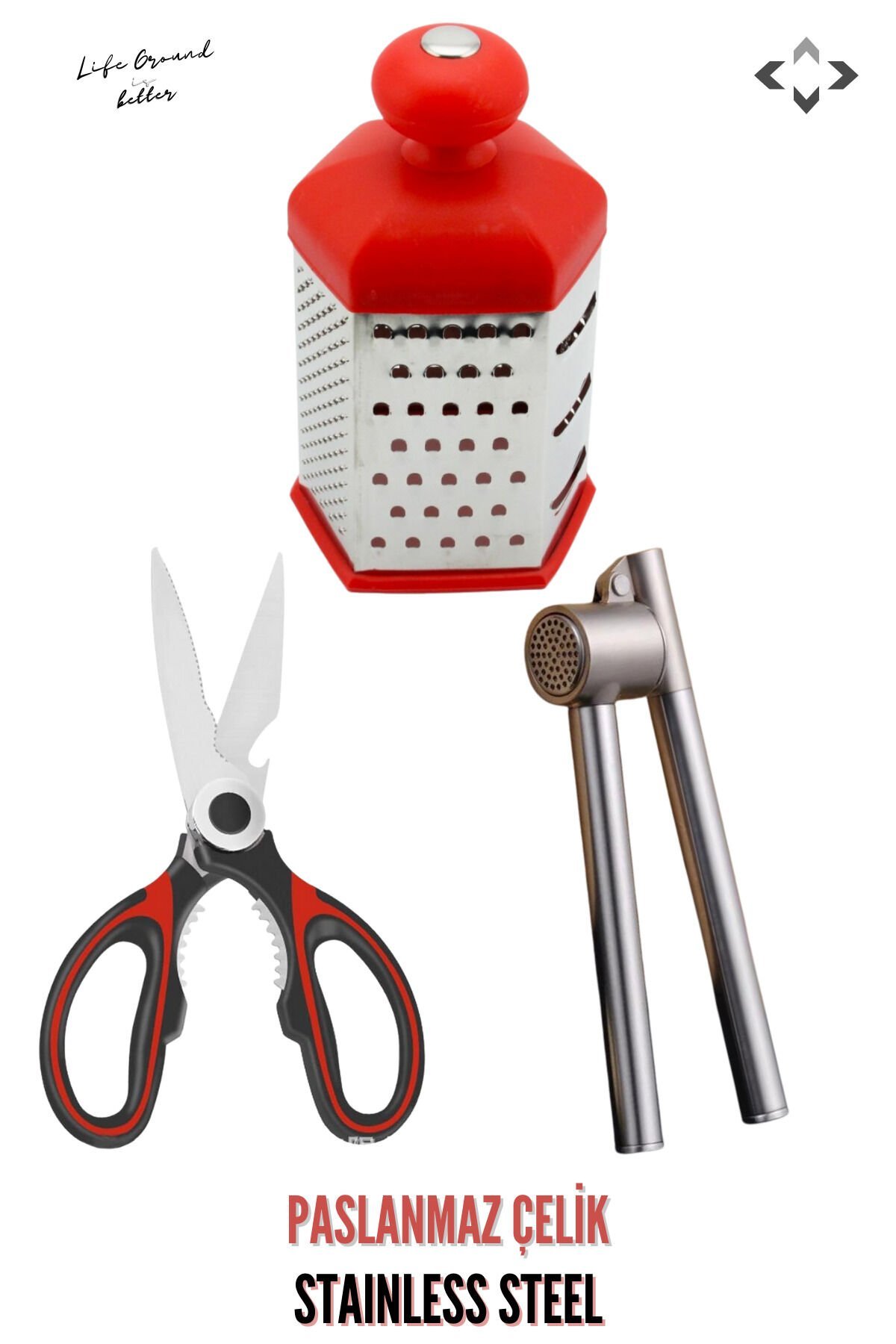 PASLANMAZ ÇELİK PREMIUM Mutfak Seti -Sarımsak Ezici-Mutfak Makası-6GEN Rende-3 Parça Çeyiz Seti