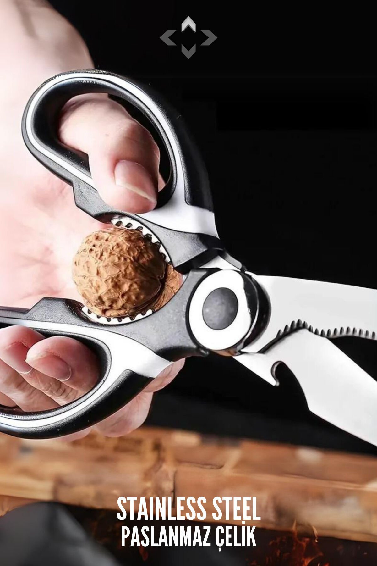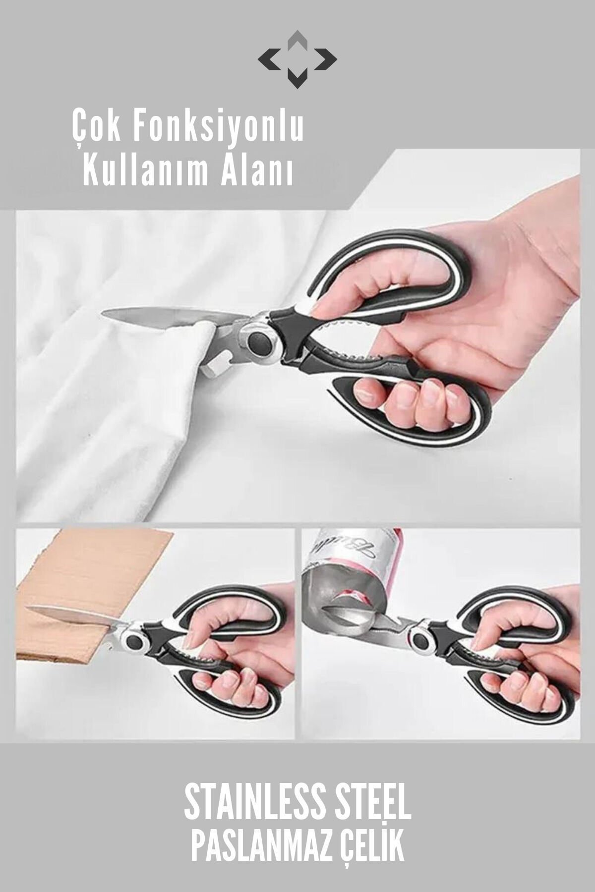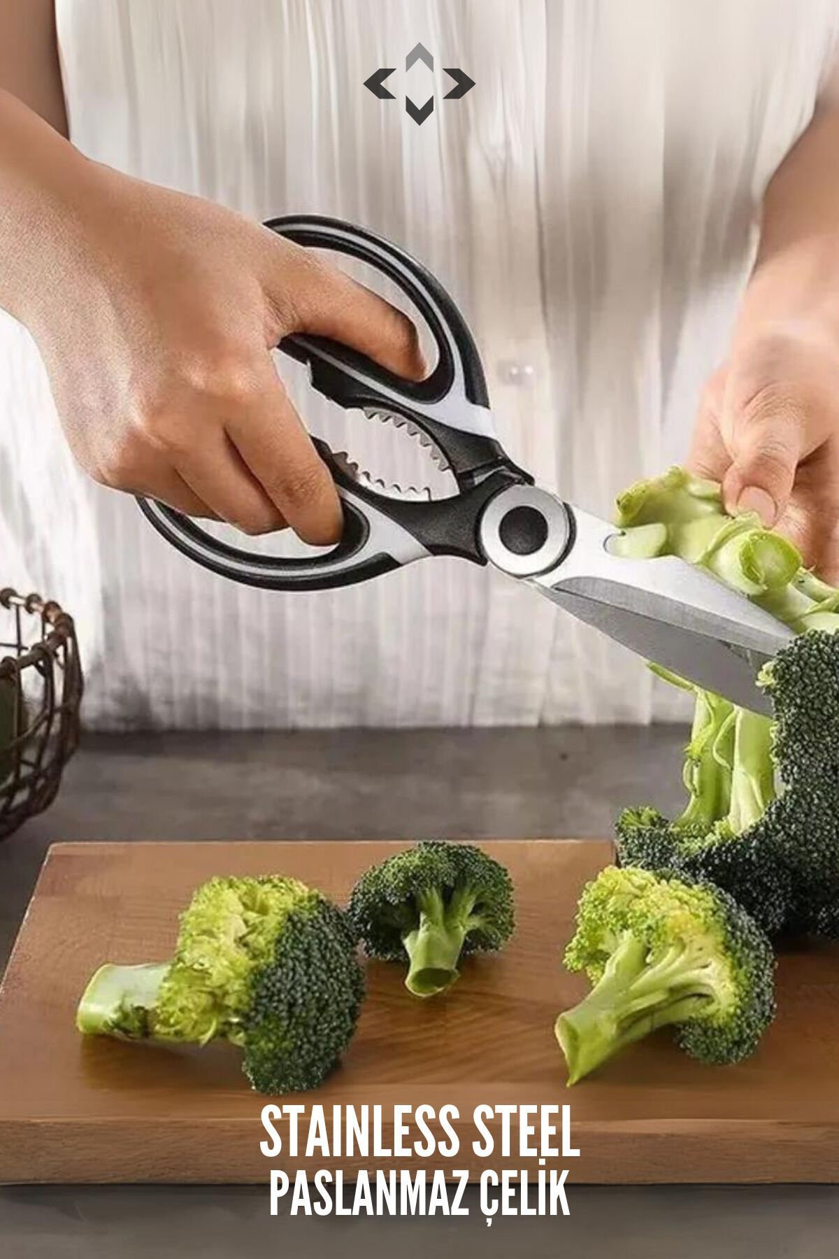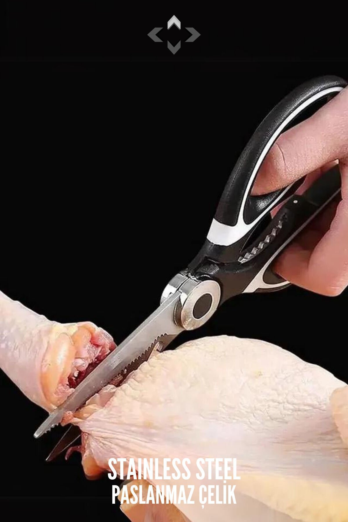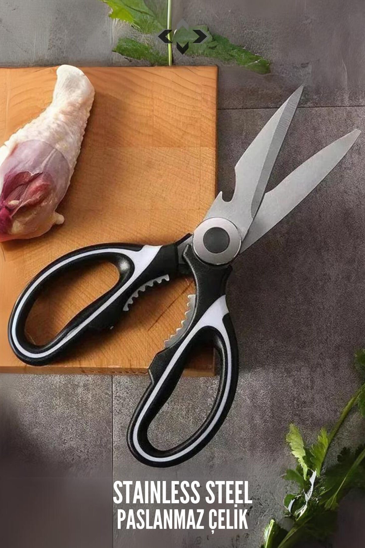 Bu çok amaçlı mutfak makası, hem ev aşçıları hem de profesyoneller için ideal bir yardımcıdır; yemek hazırlama sürecini hızlandırır ve mutfağınızda zamandan tasarruf sağlar. Paslanmaz çelik yapısı sayesinde koku ve leke tutmaz, temizlemesi kolaydır.