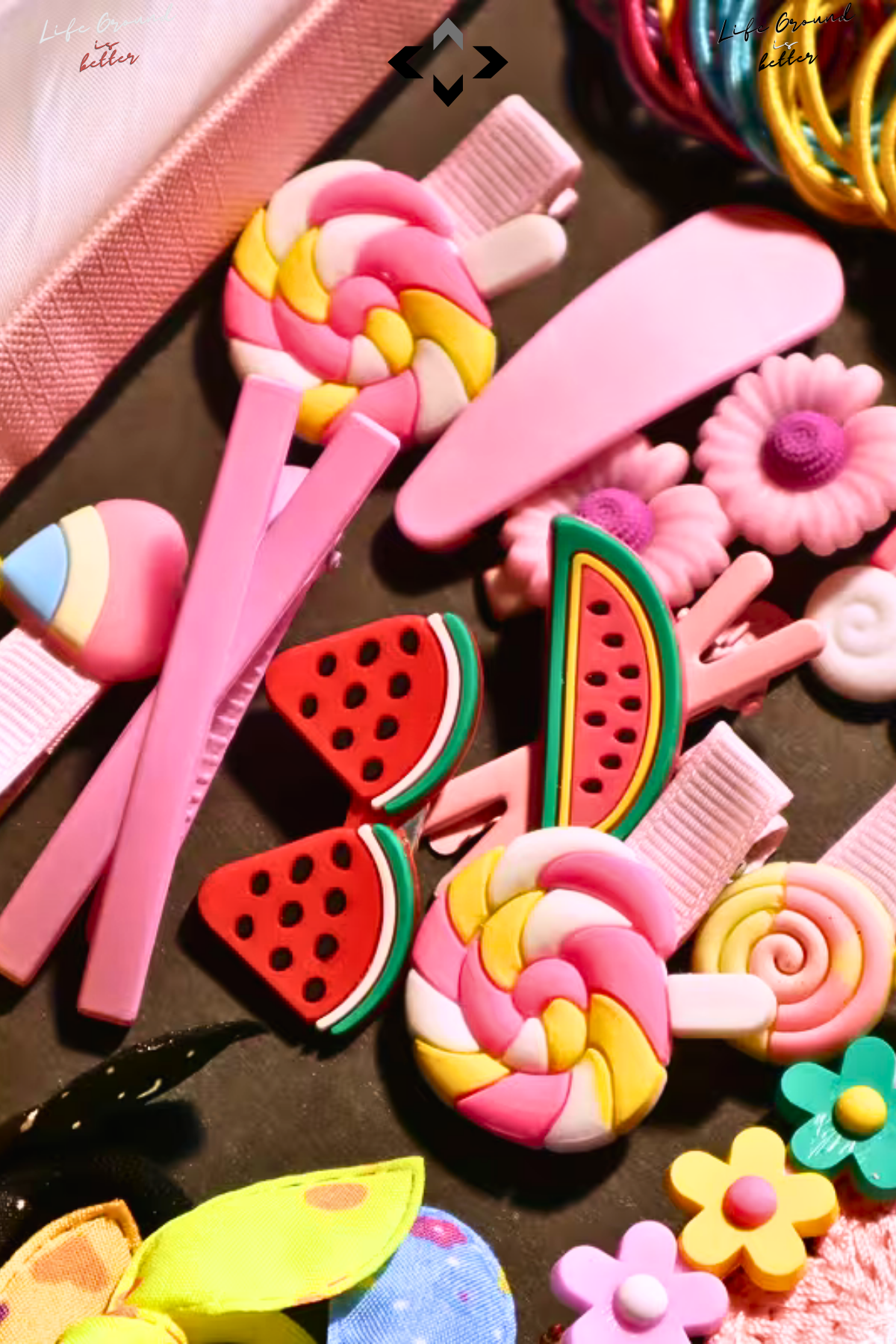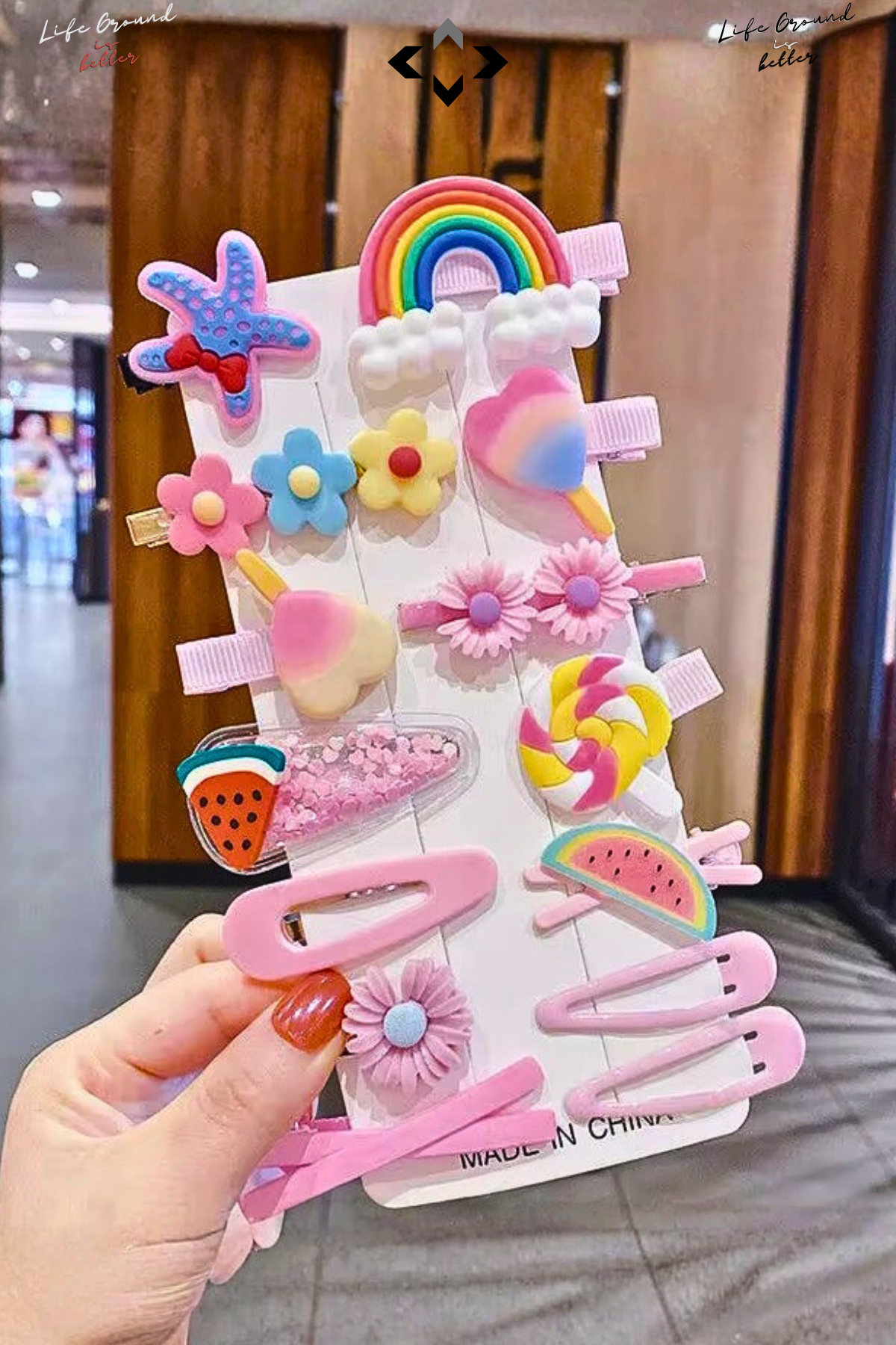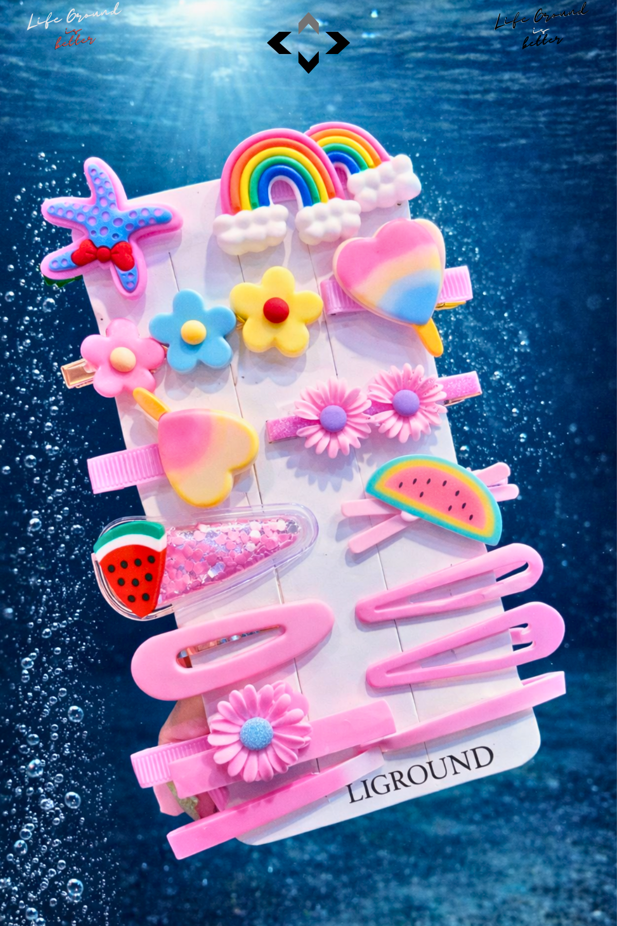 Pembe Simli Silikon Kız Çocuk Saç Tokası Seti 14’lü Renkli Desenli Çıtçıt, Peluş ve Figürlü Toka Çiçek Modeller