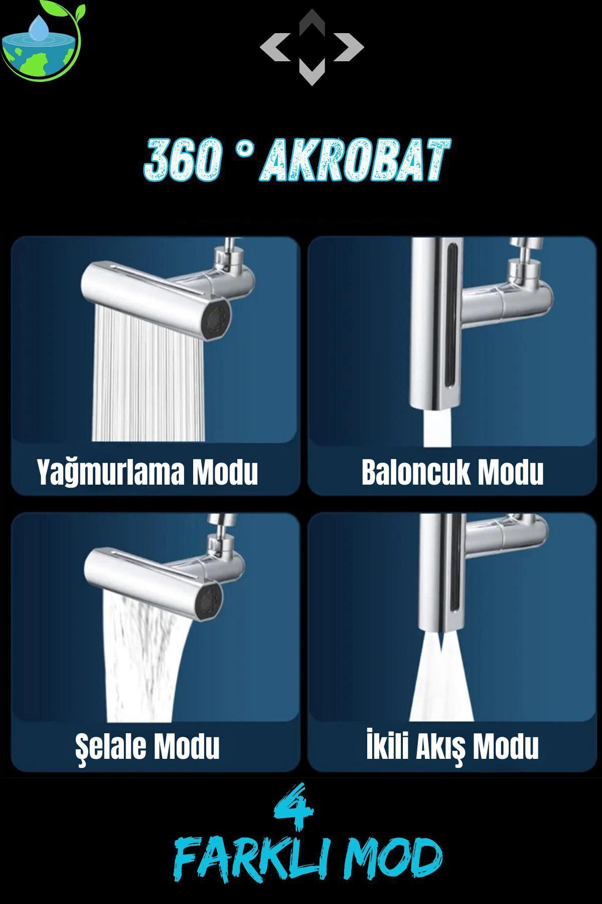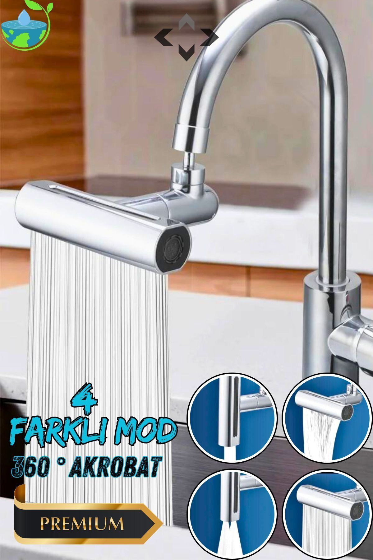 Premıum 360° Akrobat 4 Farklı Modlu Su Tasarruflu Fonksiyonel Krom Akrobat Musluk Batarya Başlığı