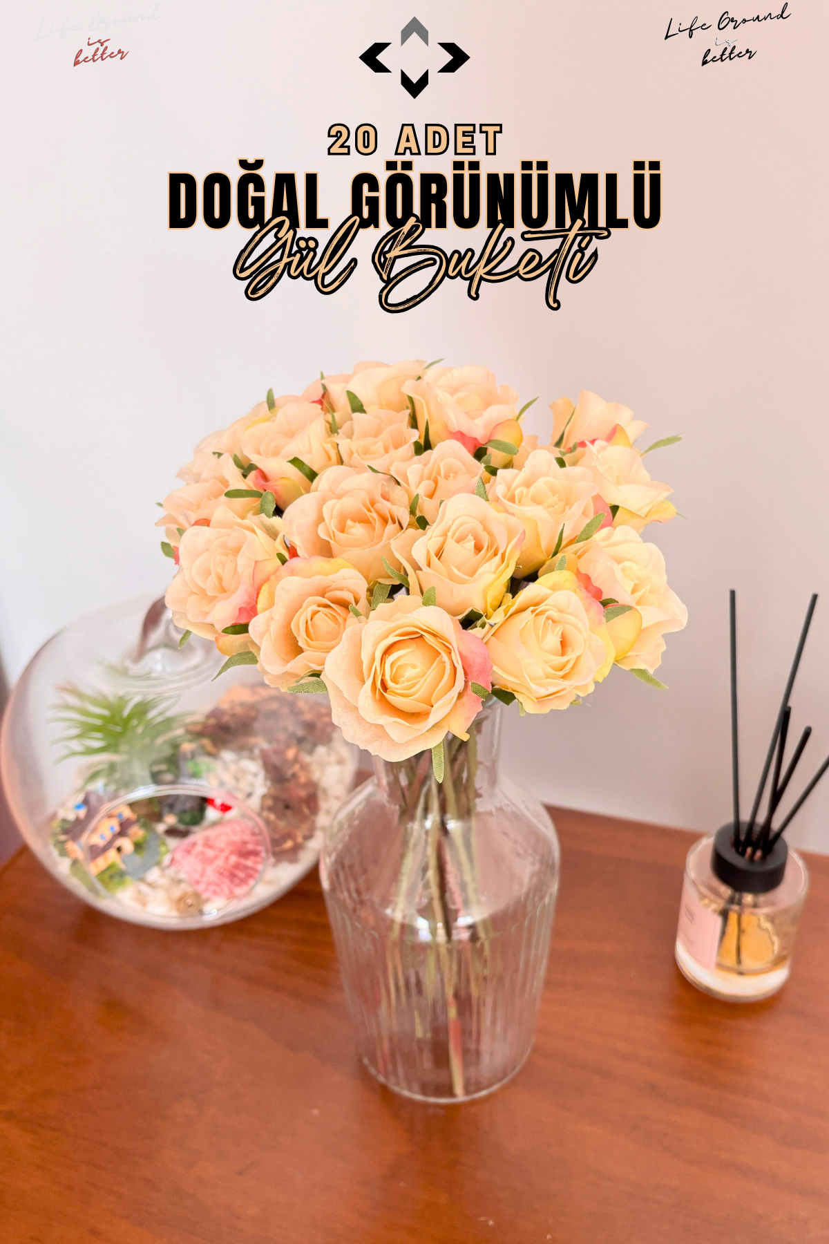 - 20 adet doğal görünümlü yapay gül, ev dekorasyonunuza canlılık katar.; - Çiçek türü olarak doğal görünümlü yapay güller tercih edilmiştir, böylece gerçek çiçeklerin estetiğini evinizde yaşayabilirsiniz.; - Yükseklik ölçüsü 32 cm olan bu yapay güller, farklı boyutlardaki mekanlar için