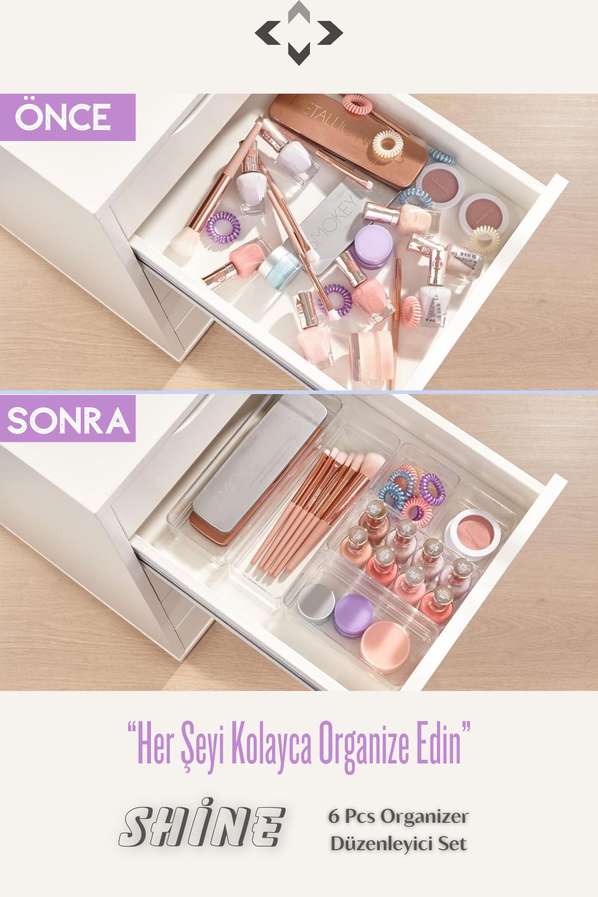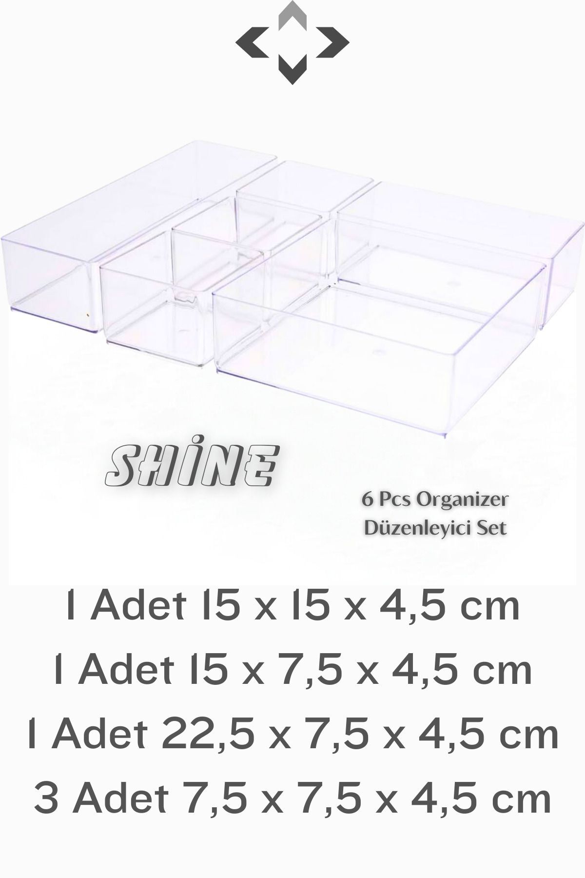 SHİNE 6 PCS Organizer Düzenleyici Set Modüler Çekmece İçi Düzenleyici Organizer Set 6 Parça ; 1 Adet 15 x 15 x 4,5 cm ; 1 Adet 15 x 7,5 x 4,5 cm ; 1 Adet 22,5 x 7,5 x 4,5 cm ; 3 Adet 7,5 x 7,5 x 4,5 cm ; Çeşitli boyutları ve ergonomik tasarımı ile makyaj, banyo, mutfak ve ofis çekmeceleriniz artık daha düzenli! ; Şeffaf rengi ile kullanım alanınıza bağlı olarak içindeki her şeyi rahat görebilmenize olanak sağlar. ; Ergonomik tasarımı ile makyaj, banyo, mutfak, masa üstü ofis gibi kullanım alanlarına uyum sağlar. ; Ofis çekmecenizde kırtasiye malzemelerinizi, Hobi malzemelerinizi, mutfakta çekmece aksesuar düzenleme ve kaşıklık olarak çok amaçlı kullanabilirsiniz ; Farklı boyutları ile her kullanım alanında gönül rahatlığıyla değerlendirebilirsiniz. ;